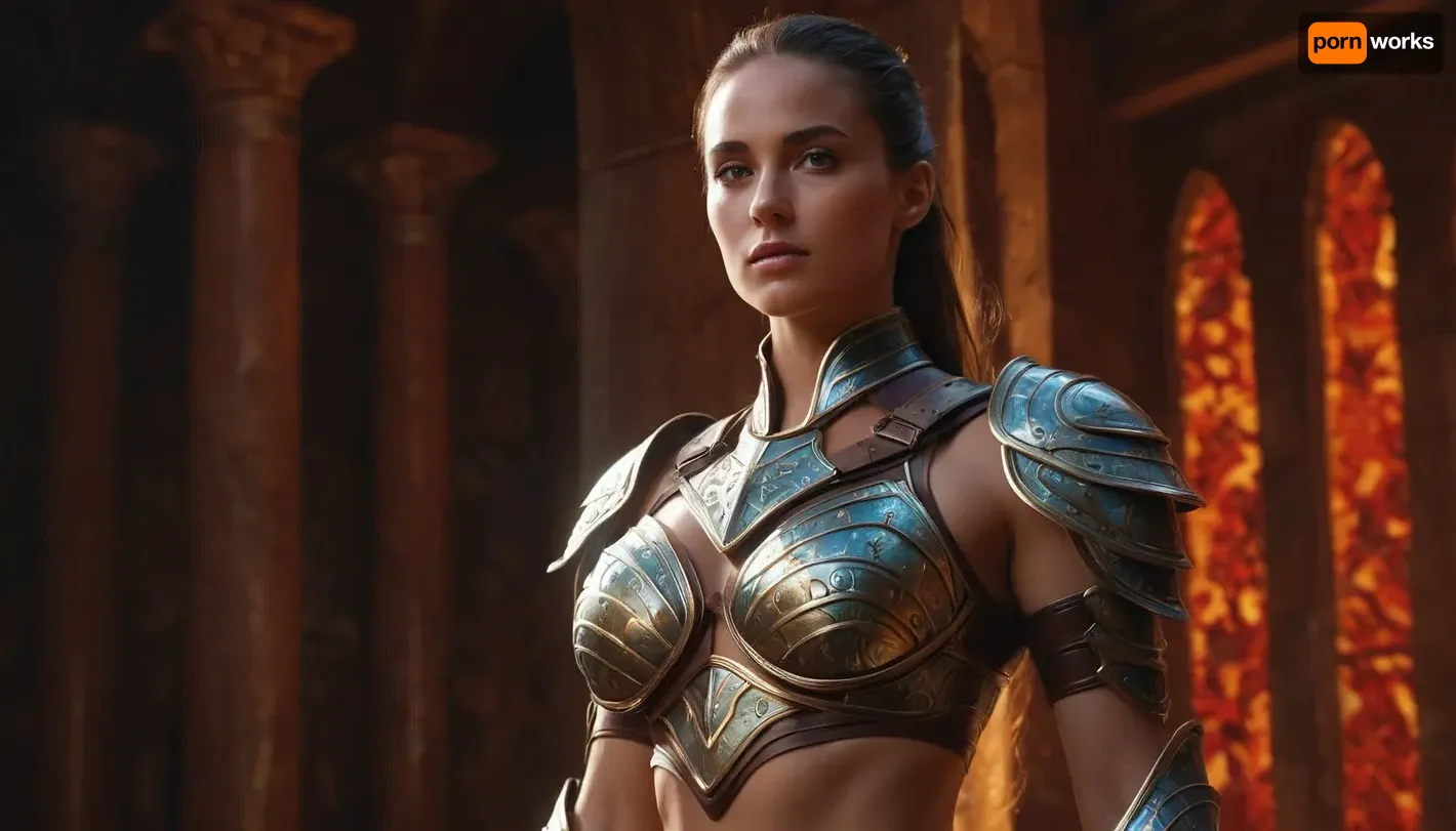 Pop surrealist painting with fantasy-inspired brush handling of a video game heroine, wearing fantastical armor crop top and wrapped digital-patterned fabric. Perfectly rendered abdominal muscles created through stylized paint application rather than realistic modeling.