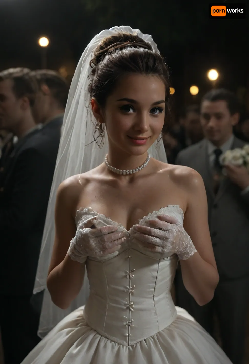 high resolution, high quality, dark scene at night, closeup of face, cute woman, smile, pearl choker, pearl earrings, (brunette Hair in elaborate updo:1.4), (standing model posing, (wedding dress:1.2), (white corset:1.2), (wedding veil:1.3), (white lace gloves), nipslip, very cute, smile, out of focus colorful flowers in a romantic outdoor background, outdoors, 3 men behind her, on, face, bukkake, cum), bellissima, downblouse, nipslip, d3v0n, 1woman, <lora:LesFemmesXL_v1.0:1.5>, <lora:dark:.4>, <lora:RealDownblouseXL2:.9>, <lora:Devon:1.4> high resolution, high quality, dark scene at night, closeup of face, cute woman, smile, pearl choker, pearl earrings, (brunette Hair in elaborate updo:1.4), (standing model posing, (wedding dress:1.2), (white corset:1.2), (wedding veil:1.3), (white lace gloves), nipslip, very cute, smile, out of focus colorful flowers in a romantic outdoor background, outdoors, 3 men behind her, on, face, bukkake, cum), bellissima, downblouse, nipslip, d3v0n, 1woman, <lora:LesFemmesXL_v1.0:1.5>, <lora:dark:.4>, <lora:RealDownblouseXL2:.9>, <lora:Devon:1.4>