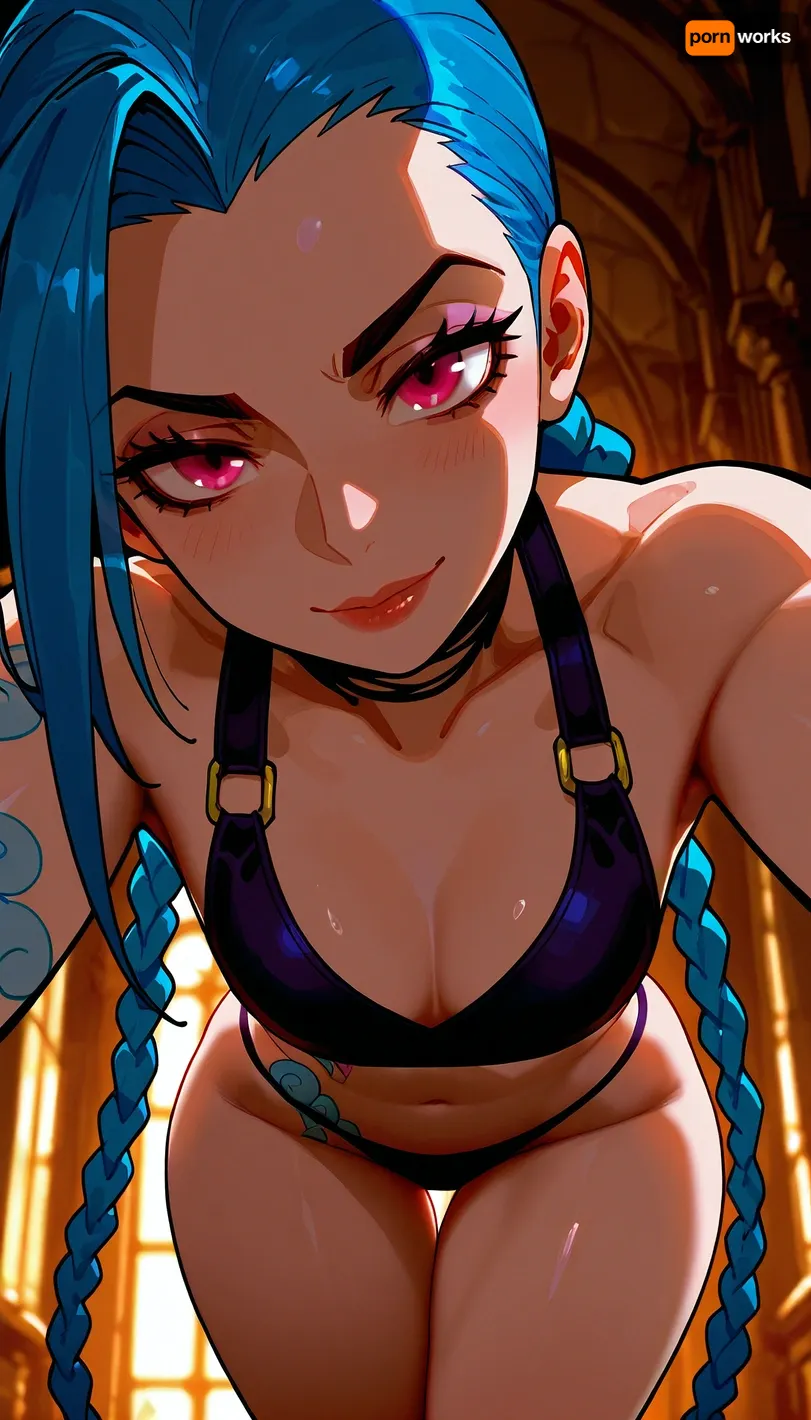 sk_comic, (Arcane style, style of Arcane:.8), (Jinx:1.4), long blue hair, braided hair, leaning forward, low angle view, cleavage, sexy pose, wide hips, seduction, intimate, sensual, horny gaze, intense sexual tension