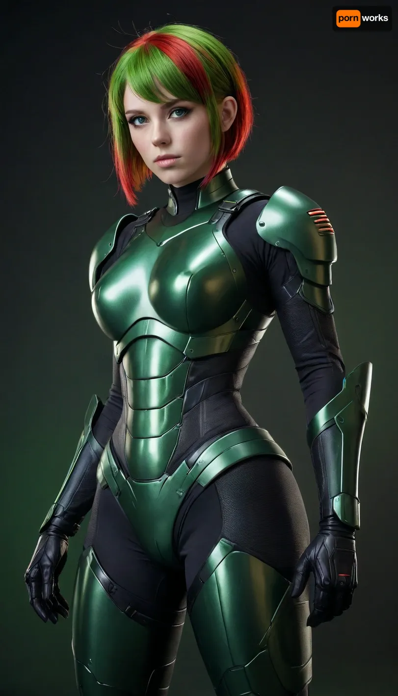 head to toe image of an android girl full dark green plastic full body armor with green and red hair in a long pixie cut hair seen from the 3/4 side, luminescent Bright Green eyes, all black background, d-cups, <lora:220437_training_data:.5>, <lora:Venus_Body_Alpha:.5>
