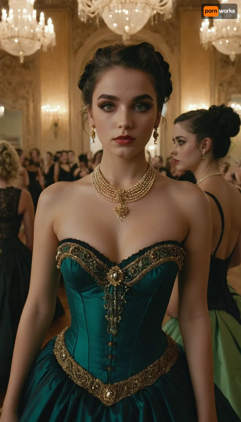 Cinematic, 35mm, Golden Hour, sumptuous ballroom, debutant's ball, goth girl dressed like a prostitute, is surrounded by beautiful debutants standing around her, the girls wear expensive ball gowns, gowns are a variety of styles and colors, green, eyes, blue, brown, perfecteyes, <lora:PerfectEyesXL:.1>, <lora:lora-sdxl-perfect-eyes:.8>