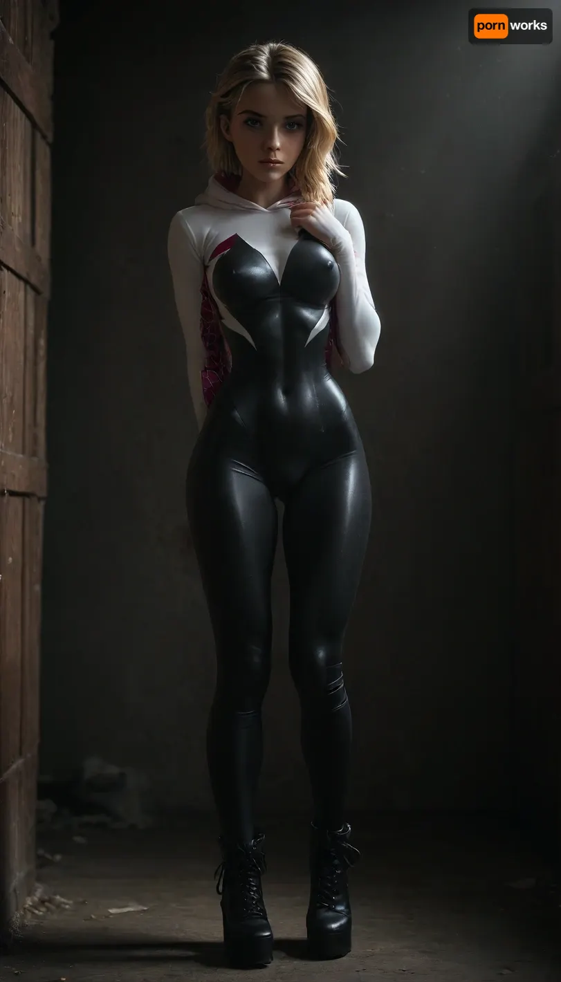 (((18 years old))), (((young))), (spider girl Gwen Stacy), Braided side Side Cornrows white Hair, (seductive shy face), (tied platform high shoes), (boots over her knees), (seductive sexy pose), ((tight outfit)), (athletic body:1.5), (athletic abs and legs:1.1), (hip gap:1.3), wide hips, (narrow waist:1.6), (white hair), (view from front:1.6), standing into the office, (makeup), ((pussy cameltoe:1.4)), (wet oiled clothes), (makeup:1.4), (oiled skin:1.7), (wet tight bodysuit:1.8), hand, 1girl, (athletic ass), (high detailed face:1.5), dim lights, (hard nipples:1.3), (big perky boobs:1), (chiaroscuro lighting:.3), <lora:HandFineTuning_XL:1>, <lora:MGLRbodysuit_sdxl:.6>, <lora:uberfit_lora_sdxl:.4>, <lora:dark:.3>, <lora:M0llY_PARK3R-000001:.8> (((18 years old))), (((young))), (spider girl Gwen Stacy), Braided side Side Cornrows white Hair, (seductive shy face), (tied platform high shoes), (boots over her knees), (seductive sexy pose), ((tight outfit)), (athletic body:1.5), (athletic abs and legs:1.1), (hip gap:1.3), wide hips, (narrow waist:1.6), (white hair), (view from front:1.6), standing into the office, (makeup), ((pussy cameltoe:1.4)), (wet oiled clothes), (makeup:1.4), (oiled skin:1.7), (wet tight bodysuit:1.8), hand, 1girl, (athletic ass), (high detailed face:1.5), dim lights, (hard nipples:1.3), (big perky boobs:1), (chiaroscuro lighting:.3), <lora:HandFineTuning_XL:1>, <lora:MGLRbodysuit_sdxl:.6>, <lora:uberfit_lora_sdxl:.4>, <lora:dark:.3>, <lora:M0llY_PARK3R-000001:.8>