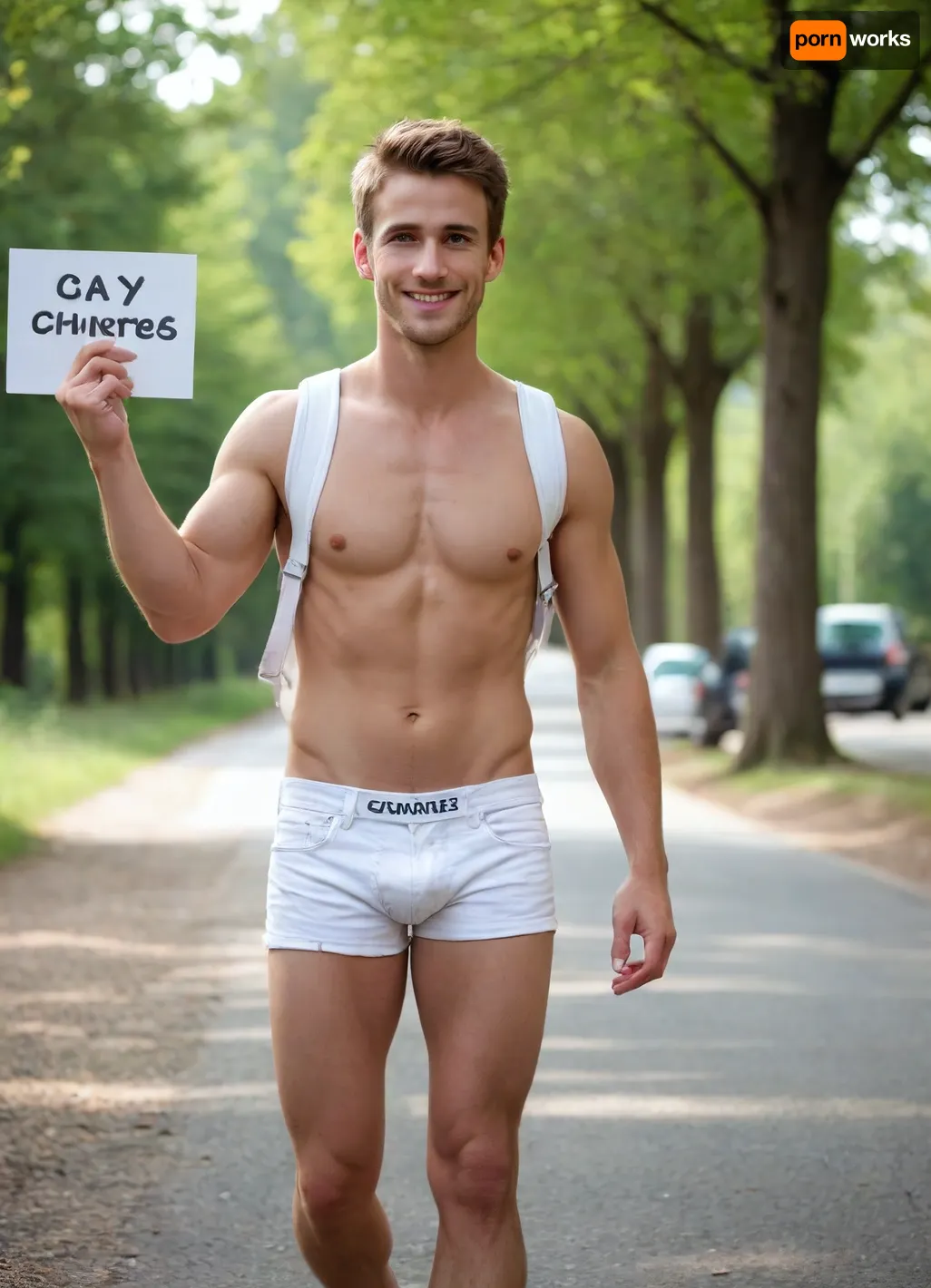 An attractive fit muscular Caucasian 26 year old male hitchhiking along scenic road. Bright day, trees, cars, river, road. Wearing an unbuttoned white shirt that shows his stomach and baggy jeans showing the waistband of his white briefs. Backpack at his feet, thumbs out hitch hiking, attractive smile, short light brown hair and stubble. Holding a sign saying GAY, white briefs showing