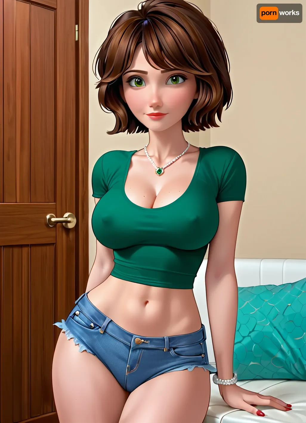 Aunt Cass from big hero 6, big breasts, very dark green T-shirt, micro daisy dukes, Hiro's room from big hero 6, short hair brunette, erect nipples, cleavage, 3/4 body view