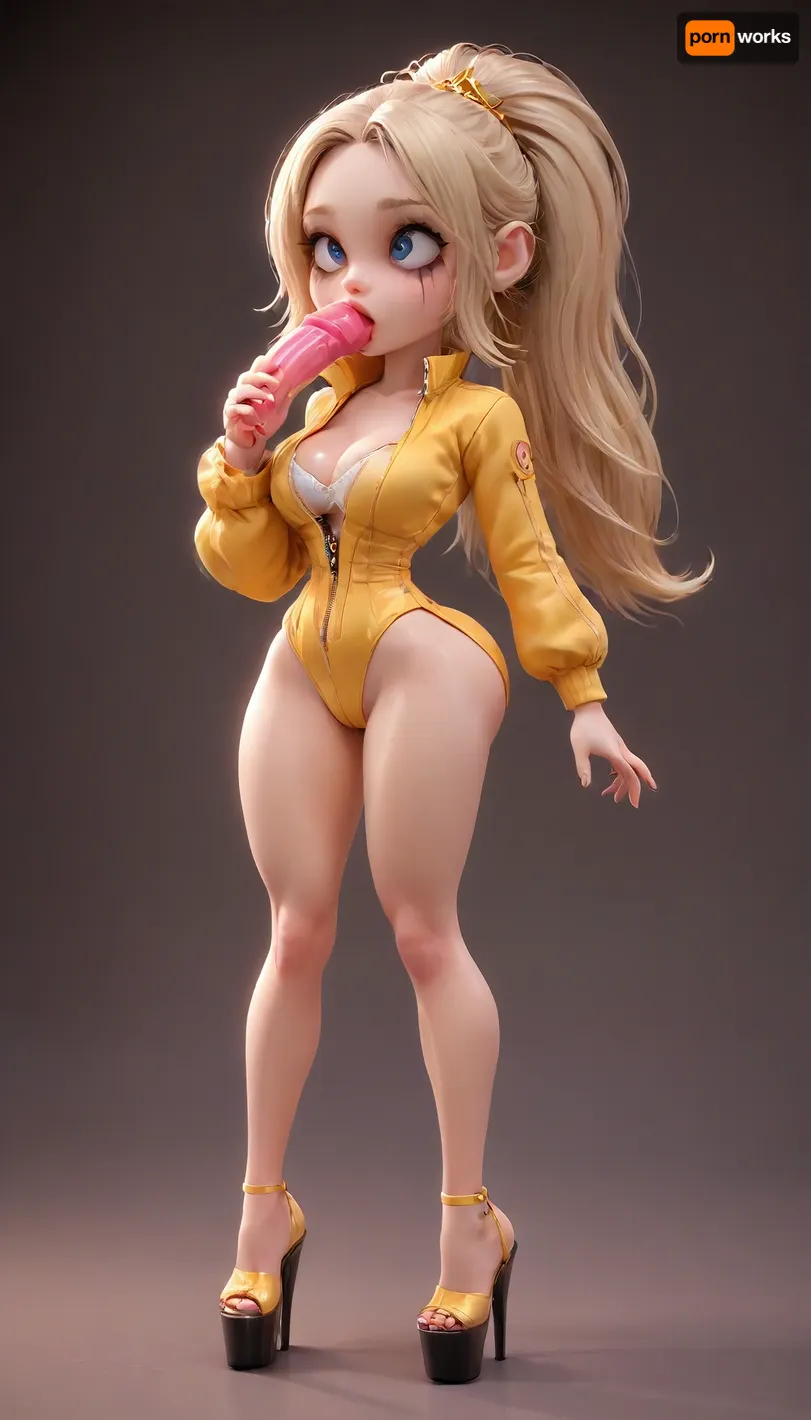 Hyper realistic, 4k, ultra detailed, ultra slut midget girl, 1girl, 18 years old, catsuit, unzipped catsuit, panties showing, Deepthoat a dildo while holding it with one hand, dildo deepthoat, deep in mouth, extremely long blonde ponytail, perfect body, wide open eyes, rolling eyes, sloppy, ruined makeup, long legs, big boobs, tiny waist, thick thighs, big eyes, long eyelashes, ultra long hair, beautiful round face, happy expression, big lips, (ultra narrow waist:1.4), (ultra long legs:1.4), platform high heels, very moisturized skin, shiny pale skin, ultra gigantic fake tits, big round ass, (gigantic boobs), (huge boobs spilling out of top:.8), (boobs spilling out:1.3), (cleavage:1.4), deep cleavage, view from the side, high details, 4k quality, bottom heavy, high ass, gigantic ass, pale skin, chibi, mablythess, <lora:ThePitXL:1.1>, <lora:Pale_Skin_SDXL_v1.0:1.3>, <lora:Designer_BlindBox-000015:.9>, <lora:mablythess:.9>