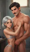 Andava, Andavaverse, Cinematic scene of a happy married couple a senior Italian-American old man, (tall, hairy, muscular, superhero body, square jaw, thick mustache, intense blue eyes, short dark hair with gray streaks), embracing his elegant mature middle-aged Korean wife, (slender hourglass figure, fit body, sleek silver-highlighted bob-cut, grey eyes, designer female glasses, wearing Victoria's Secret design lingerie), They gaze into each other’s eyes with intimacy, her expression poised and seductive, his commanding and affectionate. Soft, moody lighting with romantic tones, blending rugged masculinity and confident sensuality. Wedding rings visible. Scene evokes deep love, strength, and desire.