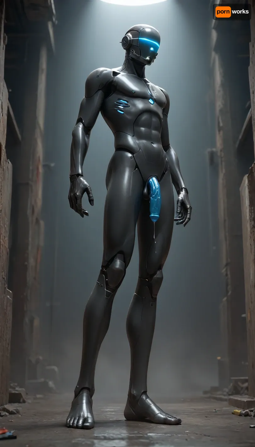 a male robot, robot, not human, dark plastic skin, with a big dark penis, curved down, flaccid, dripping blue luminous cum, standing, legs wide open, side view, seen from below, full body image. robot is huge, imposing, strong, industrial strength, 10feet tall. aggressive look. In a futuristic tech lab.